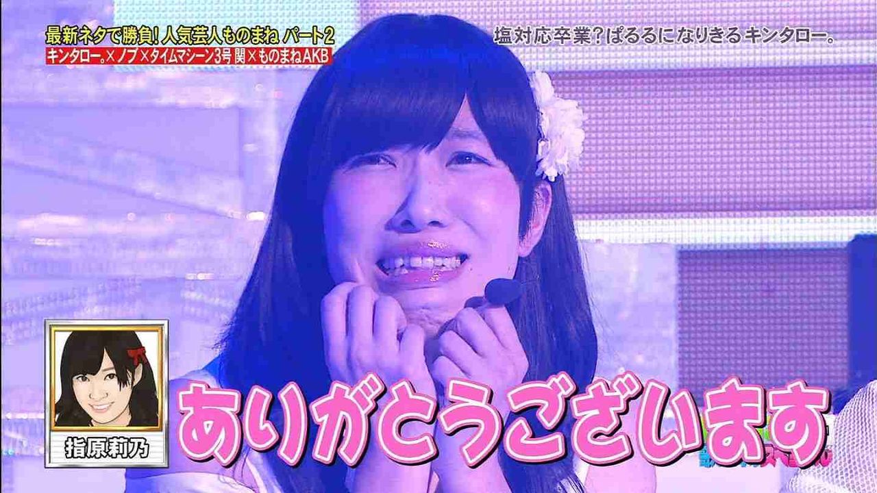 この日、キンタロー。は得意の前田敦子……ではなく、島崎遥香に扮し、総選挙のスピーチシーンを再現。そして徳光和夫や秋元康、指原莉乃、篠田麻里子らの“そっくりさん”たちと共に、AKB48の曲「僕たちは戦わない」を歌唱した。